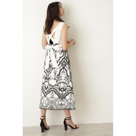 ナチュラル感のある生地に繊細な刺しゅうを丁寧にあしらったワンピース上身頃は無地ですが、スカート部分は大人らしいバランスで表現された刺繍ディテールが目を惹くデザインです。ウエストを高い位置から切り替え、バックリボンで可愛らしいアクセントをプラス。また、バックスタイルのクロスされた背中の肌見せが大人らしい抜け感あふれるポイントに。1着でコーディネートが完成し、涼しげな印象を与えてくれます。※裏地付き