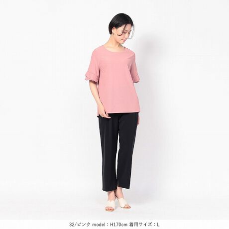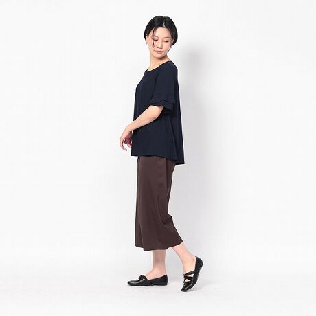 素材の落ち感をいかして裾フレアのシルエットに。後ろ下がりを4cmくらいつけています。