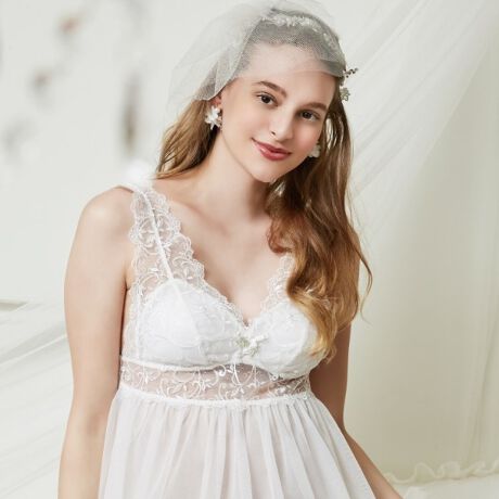 ウェディングのベールをイメージしたシアー感溢れる刺しゅうレースを、たっぷりと使った優美な印象を与えてくれるスリップです。