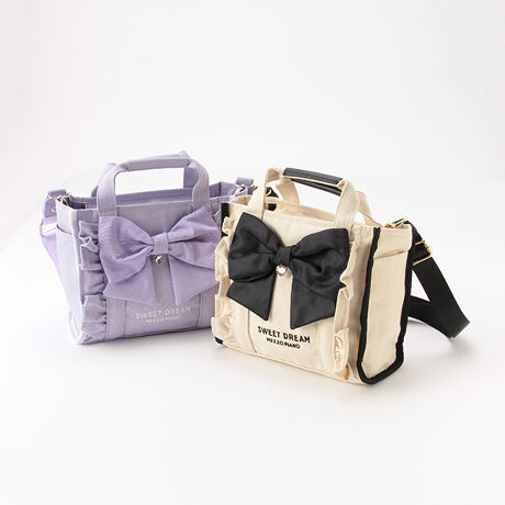 ほんのりつや感のあるグログラン素材のビッグリボンとハートチャームが上品でキュートなミニトートバッグです。素材をキャンパス地で仕上げることで、インパクトがありつつもデイリー使いしやすい表情に♪ コンパクトながら、しっかりとしたマチ幅や内側のファスナーポケット、Dカンを備えて収納力もクリア。ショルダーストラップのつけ外しで斜め掛けにも対応できる2WAY仕様のアイテムです。 ≪重さ≫F/約430g