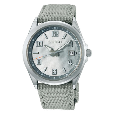淡いグレーのナイロンストラップが柔らかな印象です。