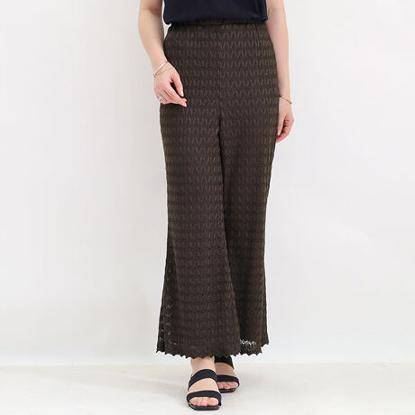 総レースのフレアシルエットワイドパンツ。繊細なレースのほのかな透け感が女性らしく、旬な着こなしに仕上がる一着。フレアシルエットが今年らしさを演出します。ぴたっとしすぎず程よくゆとりがあるので楽に着られるのも嬉しいポイント◎。柔らかな肌あたりのレースを使用。裏地もついているので、安心して1枚で着用できます。ウエストはゴム仕様でストレスフリーなはき心地。楽ちんなのに、上品でこなれたお洒落が簡単に手に入るフレアパンツです。