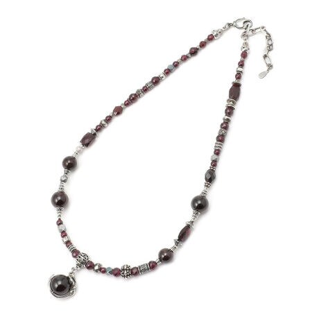 ROYAL FLASH別注商品大小様々なガーネットをふんだんにあしらったネックレス。TOPのステルスオーブが動きに合わせて揺れるデザイン。こちらのステルスオーブシリーズは別注で一から製作して頂きました。ガーネットの和名は“柘榴石(ざくろいし)”です。天然のままで美しい赤色が特徴の宝石で、ザクロのように赤いことが和名の由来とされています。ガーネットの宝石言葉には、「真実」「情熱」「友愛」「繁栄」「実り」などがあります。 変わらない愛情や変わらない友情、忠実さなど多くの意味を持つ宝石です。gunda/ガンダ1998年に誕生。ヴィンテージライクな質感にこだわったレザー×メタルコンビネーションのコスチュームジュエリー、ベルト、バッグなどを中心に1999年よりシーズンコレクションの展開を開始する。初期のコレクションでは、あくまでもトラディショナルなレザークラフトのテクニックをベースとしながらも新しい手法でオリジナリティーを追求し、マスプロダクションでは再現できない手作業ならではのラインナップを発表。細部まで創り込まれたディテールがエッジの効いたデザイン性を際立たせるだけではなく、使い込むほどになじむその製品は伝統技法に裏打ちされたauthentic感<本物感>をも確立し、他と一線を画す。以後世界中からインスピレーションを受けたコレクションはさらに幅を広げ、シーズンコレクションの他にもエクスクルーシブ感のあるハンドメイドの1点ものジュエリー、アートピースシリーズの『ONE OF A KIND』ラインなどもランダムに展開。各国のアンティークパーツやビーズ、異素材をミックスし、独自の技法を用いた無国籍な作品は類を見ず、国境やあらゆる枠を超えたボーダーレスなgundaの世界観を構築し続けている。