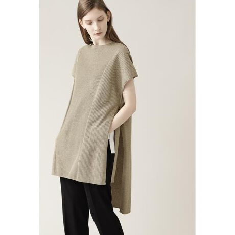 ポリエステルコットンのさらりとした素材をワイドリブに編み立てました。中心は細リブ、両サイドはワイドリブで編み地変化に。大きめシルエットのチュニックプルオーバー。両サイドのテープは軽く結んで垂らすのがおすすめです。※ピリングに御注意ください。ピリングは、着用中の摩擦作用により出来た毛玉のことで、これは素材の特性上着用の際避けられない現象です。ピリングが出来ましたら、ブラッシングか、小さなハサミで1つ1つ取り除いて下さい。