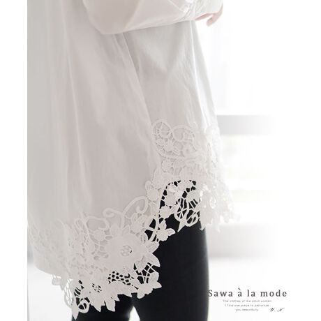 襟と裾に広がる繊細な花レースが美しいシャツブラウス。大人の魅力を引きたてる美しいレースをふんだんに施した贅沢なデザインです。ボタンを閉めてブラウスとしても、開けて羽織としても着まわせます。テールカットデザインなので気になる下半身までカバーできます。お花の可愛らしさとレースのエレガントさを合わせた上品なディテールです。