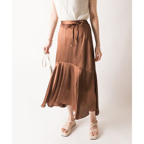裾切り替えのフレアシルエットが女性らしさ満点のサテンスカート