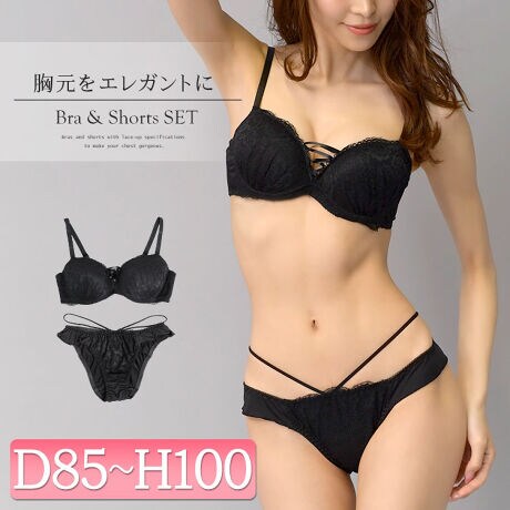【E80-H100】胸元編み上げレースブラジャー&ショーツセット 大きいサイズレディース インナー