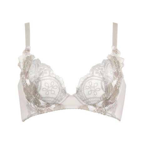 ・バック下辺の位置を下げることでブラをつけたときに気になる、脇から背中の段差をおさえ、なめらかに・バック上辺は折り返し始末で、肌にくいこみにくく、アウターにひびきにくい・カップ脇上辺とアンダー部分は、伸びのよい肌側綿混ストレッチテープを使用し、やさしい肌ざわり・(E□G)カップ…パッドを取りはずした状態でのボリューム設定・カップサイドのエンブロイダリーレースは、カラーによってプリント柄を変えたこだわりのデザイン