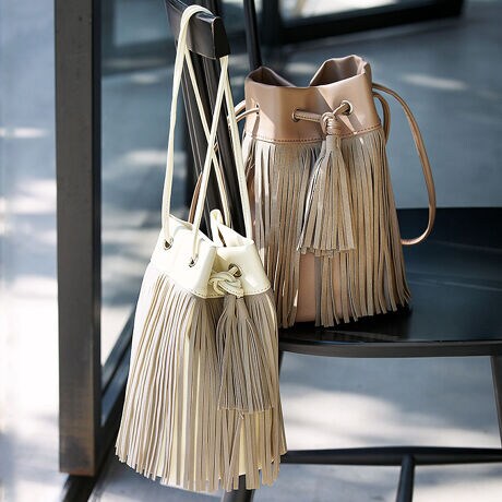 スエード調のフリンジバッグはヴィンテージ感が可愛い!バケツ型&巾着タイプのバッグはシンプルコーデのアクセントにぴったり。