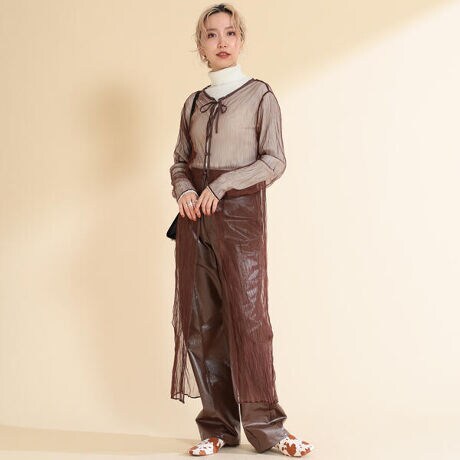 薄くて軽い素材で、インナーとして着用できるのもうれしいポイント◎。上級者向きアイテムに見えますがダークブラウンとサックスブルーの肌馴染みの良い2色展開なので挑戦しやすく、いつものコーディネートに抜け感をプラスします。