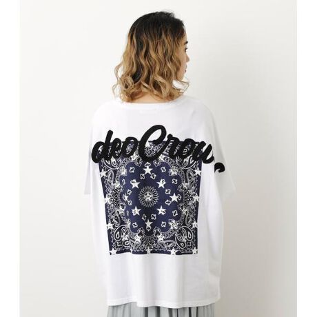 ワイドをめいっぱい広くし、体型カバーにもなるアイテム。浅めなVネックはヌケ感とさりげない鎖骨見せができ、女性らしいラインに。バックはアソートで、オリジナル柄をプリントしたバンダナをはりつけたイメージ。その上にチェーン刺繍のロゴを大胆に入れました。メンズはクルーネックのビックT型で、キッズはさりげないポンチョ型になっています。