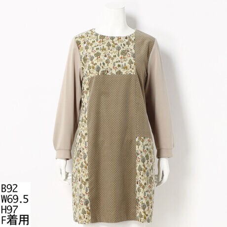 ドット柄と森の中の動物が可愛いコーデュロイプリントをパッチワーク風に組み合わせました。パンツの上にサッと着るだけでサマになる大人可愛いチュニックです。