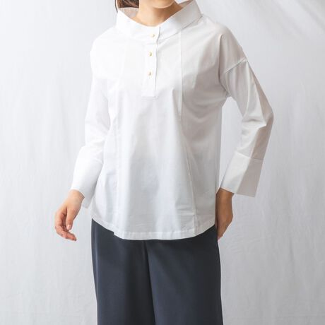 ラウンドしたスタンド襟は、程よく首から離し、抜け感をプラス。身頃も短めAラインで暑くなるこれからの時期にピッタリの白シャツです。\n\n・多少透け感あり\n・ストレッチあり\n・カラー展開はホワイト\n・サイズ展開は1(M)9号・3(2L)13号・5(4L)17号