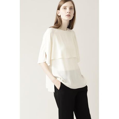 強燃糸によるシャリ感と肌さわりのよいバックサテンが特徴の梨地素材。まだまだ暑い時期にはうれしい薄手の素材でありながら、適度なハリ感と透けにくさもあり、キレイ目なスタイリングにはぴったりの素材です。スカート、パンツどちらにも合わせやすい裾部分はスッキリとしたデザインにしながらも、ウエストINすると重なりの布との対比でウエストが華奢見えする効果も備えたアイテムです。もちろんINせずそのままさらりと着こなしてもお勧めです。※この商品は、糸及び素材の特性上、引っかけ・引っかかりにより糸がとびだしたり、ひきつれが生じやすい性質をもっています。ご着用の際はご注意ください。