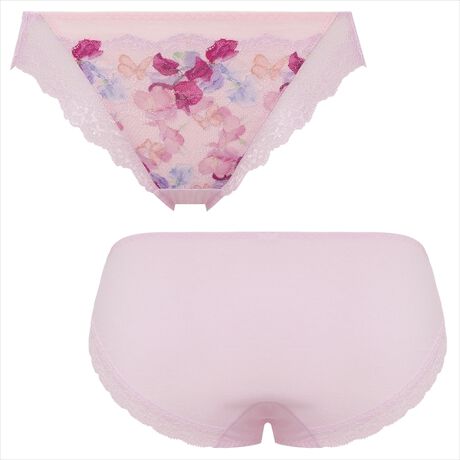 身生地は綿混素材を使用。後ろ脚口レースは裏マイクロファイバー糸づかいで、柔らかな肌ざわりです。前後脚口はレース仕様なので、お肌にくいこみにくくやさしい肌当たりです。スイートピーのお花が空に向かって活き活きと伸びている様子を、プリントレースで表現。蝶々モチーフが軽やかさと透明感のアクセント。小花やリーフ柄で、自然界のモチーフをつめこんだレースに仕上げました。