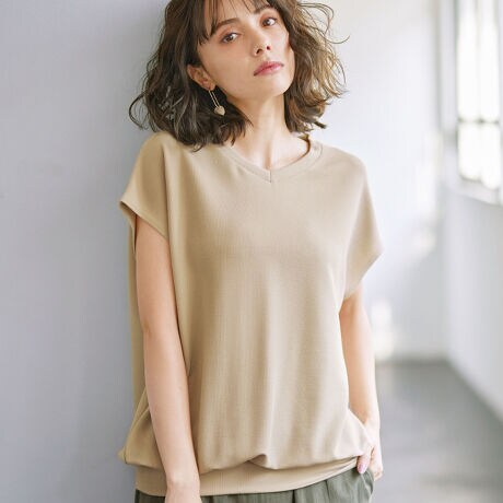 Vネックでデコルテはすっきり、フレンチスリーブで二の腕も程良くカバーしてくれる、上品なトップス。
