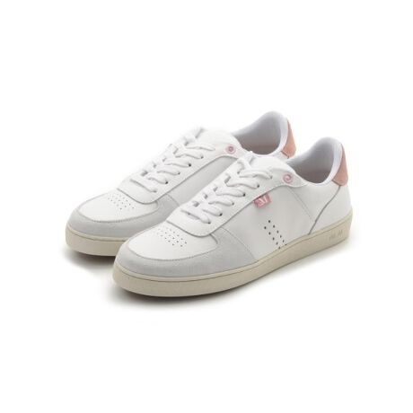 ピンクのアクセントが効いたホワイトレザーとスエードのロースニーカー。80年代のレトロなスポーティスタイルからインスピレーションを得た愛らしいデザイン。かかと部分のヒゲマークがさりげなくも遊びを利かせています。