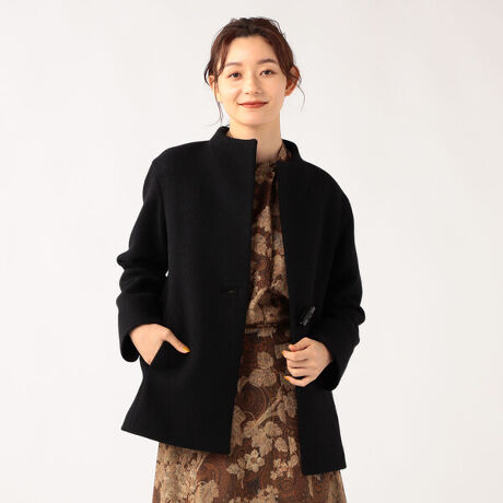 シンプルな中にもシルエットにこだわりモダンな表情に仕上げたフレアコート。フロントは比翼仕立てのすっきりとしたルックス。レザーのトグルがワンポイントになっています。裏布はブランドロゴとアザミモチーフをモノグラム風にデザインしたプリントを採用し、さりげない華やかさをプラスしたアイテムです。
