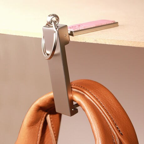 開くとバッグハンガーとスマホスタンドに変身するスタイリッシュで便利な2WAYキーホルダーです。お出かけ先のカフェやバー、レストランなどで、荷物置き場に困ったときテーブルに取り付けてバッグやリュックなどを引っ掛けておくことができます。またスマホで動画を見るときやテレビ通話、自撮り・セルフタイマー撮影時には縦置き・横置きどちらにも対応したスマホスタンドとして機能します。バッグハンガーとして使うときは、本体をコの字型に開き、滑り止めゴムがついている面をテーブルなどの天板に深くのせます。本体先端のフックに、バッグを引っ掛けることができます。スマホスタンドとして使うときは、本体をくの字型に開き、本体の長い辺をテーブルなど平らな場所にのせます。立ち上げたほうをスマホの背面の支えに、スマホを立て掛けるように設置します。スマホの下端は、本体端の突起で押さえられます。スマホの縦置き・横置きどちらにも対応します。注意:バッグハンガー時の耐荷重は約3.5kg以下