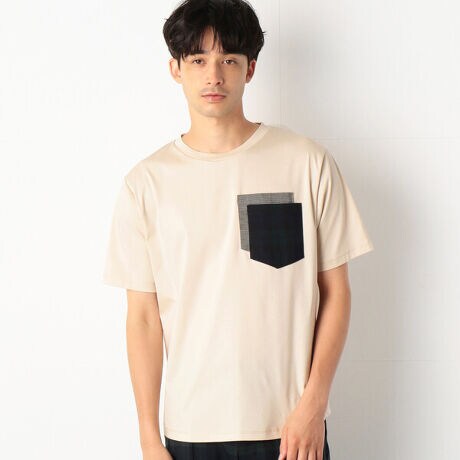 異なる2種類のチェック柄のポケットを、ずらして重ね付けしたダブルポケットTシャツ。