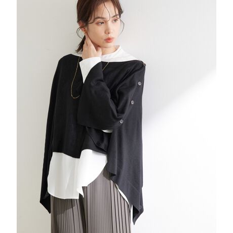 初秋から活躍するプラスワンアイテム。フロントボタンでカーディガンのように、ショルダーラインにボタンを持ってきてポンチョプルオーバーのように。ボタンを留めずに軽く結んでストールのように。気分に合わせて色々なスタイルを楽しめるマルチウェイベストです。