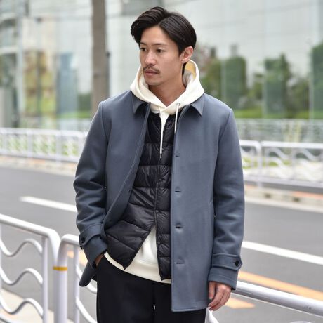が出るので上質とされています。\nスーツの生地などでよく見かけますが、だいたい100'S〜120'Sが一般的に使用されています。\n\n着用model: H177 着用サイズLARGE\n\n-------------------------------------\n生地の厚み:厚手\n伸縮性:無\n透け感:無\n光沢感:有\n水洗い:不可\n-------------------------------------\n【スタッフ着用コメント】\n《スタッフ1》\n身長:170cm/体型:やせ型/普段サイズ:M/着用サイズ:M\nサイズ感:肩、身幅、アームホールと窮屈に感じることなく着ることができました。着丈のバランスも良く、暖かいです。Sサイズも着ましたが、こちらも問題なく着ることが出来ました。ジャストサイズで着たい場合はSサイズ、インナーにジャケット等を着込んで、余裕が欲しい方はMサイズを選んでいただくと良いかと思います。\n素材感:非常に柔らかく、弾力のある素材感です。\n着心地:ジャケットを着ているかのような仕立てで、冬のコーディネートをグッと格上げしてくれるアウターです。\n-------------------------------------\n\n※画像の商品はサンプルです。\n実際の商品と仕様、加工、サイズが若干異なる場合がございます。