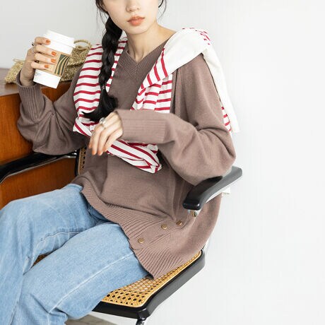 裾のゴールド調ボタンがきらっと可愛いアクセントをプラスするニットプルオーバー。