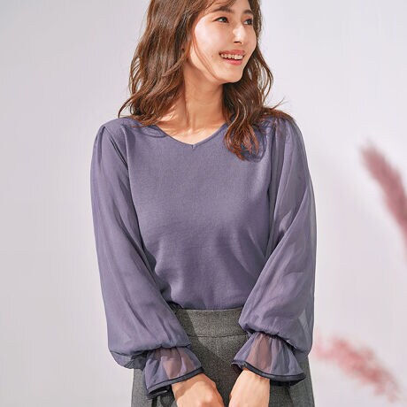 透け感のあるシアー素材を重ねたキャンディスリーブが、フェミニンさ抜群なニット。絶妙な丈感でウエストインもアウトもキマり、使い勝手も◎。身頃はモチモチとした素材で、肌ざわりのよさも自慢。