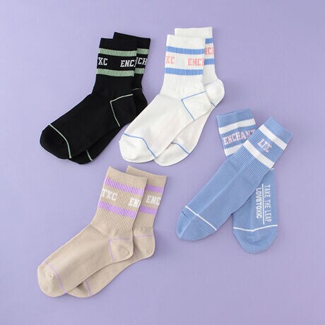 カラフルなラインが着こなしにスポーティーなリズムを添えるクルーソックスです。ロゴのアクセントも視線キャッチ作戦に一役買ってくれそう♪ 足首部分はリブ地で切り替え、フィット感のあるはき心地に仕上げました。スニーカーはもちろん、サンダル合わせもおしゃれ上級者風に見えるのでおすすめです。