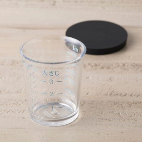 見やすい目盛の計量カップ。一時置きに便利なフタ付きです。