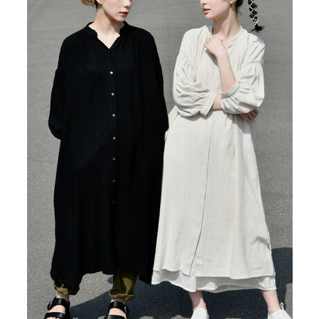 春夏らしいリネン混の素材を使用。リネン独特のネップはシャリ感があって涼し気な肌当たり。 レーヨンのやわらかさもあるので、ドレープがでて女性らしい印象に。袖はゴムシャーリングでふんわりとやわらかなシルエットがかわいい! 首元はバンドカラーでスッキリとした印象に◎フロントはボタンあきになっているので、羽織にもなる2WAY仕様が嬉しいポイント!春から秋まで長い期間着て頂けます。