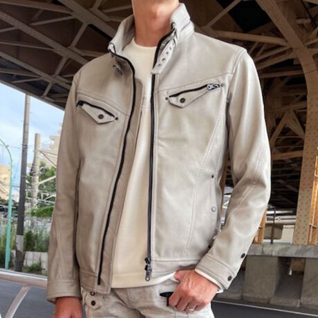 二枚衿テザインが特長のライダースデザインブルゾンです。ねじり切り替えを入れたツイスト袖を採用する事で、より動きやすくい作りになっています。生地には質感の良いラム調湿式合皮を使用。表面にはエンボス加工の上にムラプリントを施してリアルな陰影感を出しています。基布にカットソー素材を使用しているので伸縮性があり、着心地も抜群です。