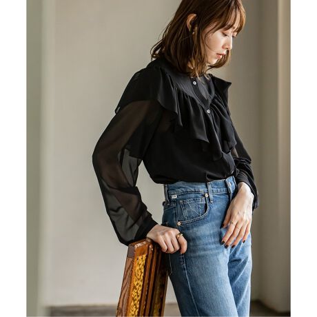 ダークカラーで大人なフェミニンスタイルに最適で、ヨークを囲むワイドフリルがクラシックでトレンド感のある一枚。