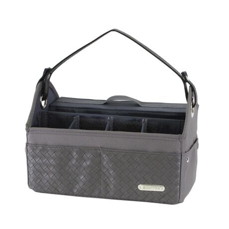 リモコンや小物類をスマートにまとめることができ、ティッシュケースにもなる、リモコン&ティッシュバスケット!散らかりがちなリモコンや、机の上の小物の整理整頓に便利なバスケット。後面にはティッシュを入れることもできる。組み立ては簡単!本体に底板を入れて、仕切り板2枚をマジックテープで固定するだけ。ティッシュカバー側の仕切り板は、ティッシュボックスの厚みによって調節が可能なのもうれしいポイント。前面に2個のポケット、側面にも左右それぞれに1個ずつポケットが付いているから、カード等なくなりがちな小物の収納に便利。取り外し可能な持ち手付きで、持ち運びもラクラク♪コスメやベッドサイドのメガネや小物類、車内の細々したものをまとめる車用の収納バスケットとしても活躍◎