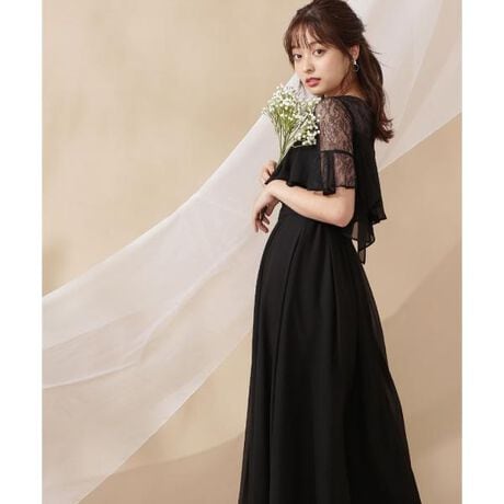 【商品特徴】ほんのり透けるデコルテやスリーブデザインがフェミニンな雰囲気のドレスです。シアーなレースで二の腕をほっそりと演出し、胸元のラッフルが女性らしさを引き立てるデザインです。ウエスト部分はシャーリングゴムで着心地もよく、フィット&フレアシルエットで大人っぽく着られます。【スタイリング】肩が隠れるのでボレロや羽織りがなくても、ハレの日に一枚で着やすいです。