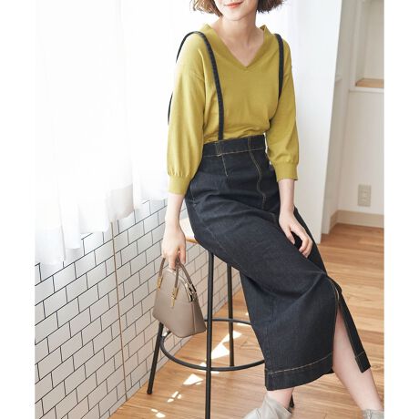 ・すっきりとしたナローシルエットとミディアム丈が大人なデニムスカート。