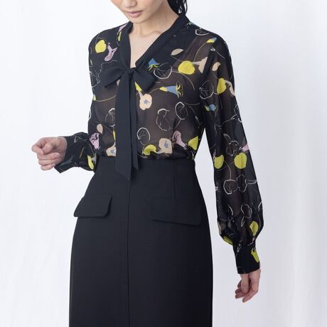 ブラックベースで落ち着いた中に鮮やかなカラーがパッと鮮やかに効いていて、顔が締まって見えるフローラルプリントです。シフォンの軽やか且つエアリーな素材感が、女性らしい雰囲気を演出。ボウタイの幅を調整することで、首回りがスッキリ見えるデザインにしています。タックアウトした際、丁度良い着丈にこだわっています。