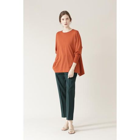 ポリエステル・レーヨンの混紡糸を撚り増しし、先染めにすることで、従来よりもスッキリとした風合いと、ダブル組織にすることでさらに適度なハリ・コシを持たせた、ストレッチ性に富んだコンパクトな綾二重素材です。前回のダブルクロスパンツの形を改良、進化させ、全体的にサイズ感を細身にしております。また、ウエストのおさまりを安定させるために、サイドからウエストベルトの切り替えを入れております。ハリ感、厚みのある素材なので、トップスをウエストにINして着用する方がより脚長に見えながらも、ヒップにはゆとりがあるので腰回りは楽ちん、という女性に優しいボトムです。