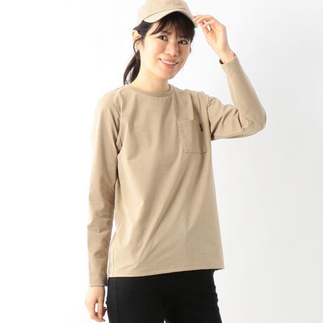 ポリエステル100%の素材ながら、膨らみのあるコットンのような風合いを表現。吸汗速乾、防シワ、抗ピリングといった機能性も備えています。高収縮糸を使用しているため、伸び感があるのも魅力。コットンに比べて軽量かつドライタッチで、着心地の良い仕上がりです。スポーティなラグランスリーブのリブ付きデザインから、より着回ししやすいセットインスリーブのベーシックなデザインに変更。春夏から肌寒い秋口まで1枚で着られ、インナーとしても活用しやすい肉厚感。幅広いシーズンのさまざまなコーディネートに活躍します。UVプロテクト(UPF50+、紫外線カット率95%以上)機能付き。
