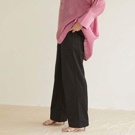 気になるヒップや太腿あたりにゆとりを持たせ、後ろはウエストゴムにしているので履き心地もとても楽々。カジュアルなデザインながら美脚シルエットで品のある雰囲気に。