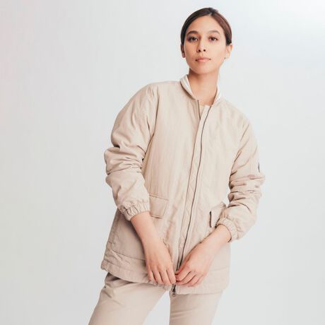 ボンバージャケットを彷彿とさせるデザインを、少し長めの丈感でリミックス。シワ感を備えたヴィンテージライクな質感に撥水機能をプラスした、ハイブリッドな素材使いも際立つ1枚です。ダブルジップファスナーで着こなしのアレンジも自由自在。後ろはラグラン、前はセットインのスプリットラグランスリーブによる、フレキシブルな動作性も特徴です。