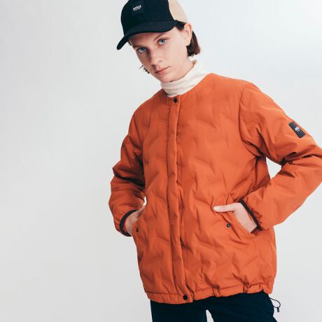 特殊な二重織りのキルティングで羽毛を充填したダウンジャケット。 ヒップに少しだけ掛かる絶妙な丈感とゆったりしたシルエットは、デイリーユースで着たくなること請け合い。インナーのコーディネイト次第で様々な変化を楽しめる、ノーカラーの衿元も特徴です。 ダウンジャケットの表情にオリジナリティを表現する、エンボスで表現した表地のパッキングも特徴的。
