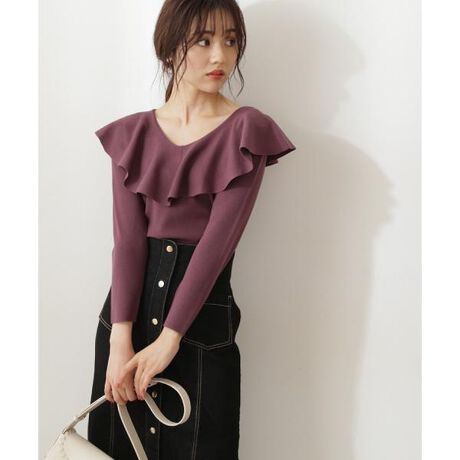 【商品特徴】ふんわりとしたラッフルデザインがフェミニンな雰囲気を叶えるニットです。肩にかかるラッフルディテールやV開きでさりげなく華奢見せを叶えてくれます。普段使いはもちろん、デートなどにもおすすめな大人可愛いアイテムです。見頃はコンパクトなシルエットなのでウエストインがオススメです。【スタイリング】タイトやフレアスカートまで着回しできます。