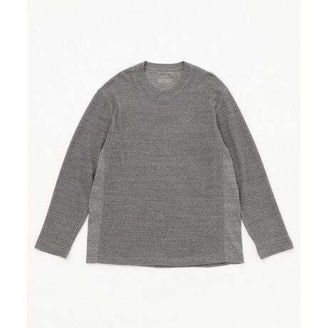 光沢感、しっとりと滑らかな肌触り、ふっくらとした風合いが特徴の地球に優しい素材です。立体感のあるワッフル組織は伸縮性に優れ着心地抜群です。また着崩れを防ぐ為ストレッチ糸を入れて仕上げています。脇部分を天竺生地で切り替えスマートに見えるよう設計。1枚で着ても様になるTシャツです。ライトグレー(003カラー)は淡い緑色の色付き原綿(SEA GREEN)を使用。染めずにそのままの色味を活かしました。今期の新色004カラーはSEA GREEN×黒糸をブレンドしたチャコールグレーです。 ナチュラルで深みのある色合いが魅力的です。