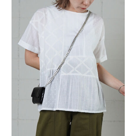 刺繍やカットジャガードなど、色々なテクニックが光る素材をパッチワークでつなげたブラウス。 多彩な素材使いながらも、全てを同色にすることで着やすい落ち着いた印象に仕上げています。 シルエットも、Tシャツのようなシルエットにすることでコーディネートにこまらないベーシックな印象に◎ 裾にむかって少しだけギャザーで広げているのがかわいい!