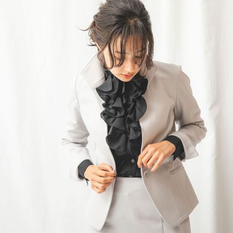 しっかりとした高密度のポンチ素材を使った、シャープな表情のスタンドカラージャケットです。ソフトな肌触りで軽く、ビジネスシーンにおすすめの1着。身頃はダーツを入れてすっきりとさせ、女性らしいシルエットに仕上げました。卒園式・卒業式・入園式・入学式のフォーマルシーンやリクルート・通勤のビジネスシーンに活躍するセットアップスーツ対応のジャケットです。同シリーズで、ポンチタイトスカート(30−12−08−995)、ポンチテーラードパンツ(30−12−09−996)があり、セットアップでもお召しいただけます。