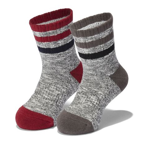 デイリーでの使用に重宝する2足セットのキッズ用カジュアルソックスです。肌当たりのよいコットンをメインに、強度や伸縮性に優れる化繊を混紡。アーチサポート機能を備えフィット感がよく、シューズ内でのズレを軽減します。銀イオンによる抗菌防臭効果を発揮するポリジン加工を施し、嫌なニオイを軽減。中厚手のローゲージ風デザインです。