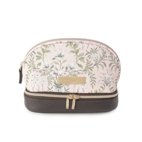華やかなフラワープリントときちんと感のあるフェイクレザーのコンビポーチ。