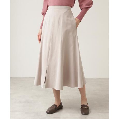 ややフィブリル感のある秋らしいピーチタッチのサテン生地を使用したミディスカート。パネルで切り替えた裾に向かってきれいに広がるフレアシルエットが魅力です。フロントに入ったスリットがさりげないデザインポイント。シンプルなニット、ブラウスと合わせるだけで今年らしいコーディネートが楽しめます。※モデルの着用画像の場合、光の当たり具合により、実際の色味と異なって見えることがございます。色味は、商品単体の画像をご参照ください。