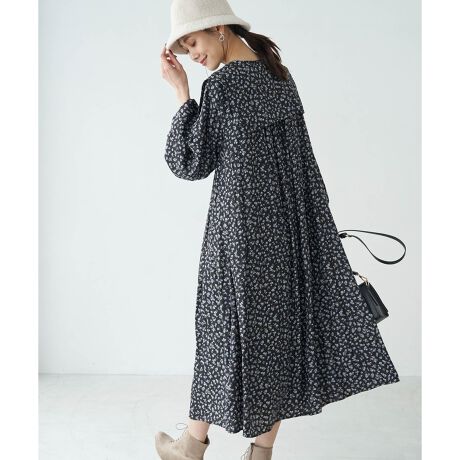 ・小花プリントのボリュームスリーブワンピース。